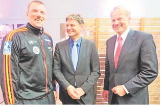 Uni-Präsident Prof. Joachim Hornegger (Mitte) beim „Wirtschaftsrat für Spitzenhandball in Erlangen“, der Karl-Heinz-Hiersemann-Gesellschaft, mit HC-Aufsichtsratschef Carsten Bissel (rechts) und dem Erlanger Bundesligatrainer Robert Andersson. Foto: Greiner